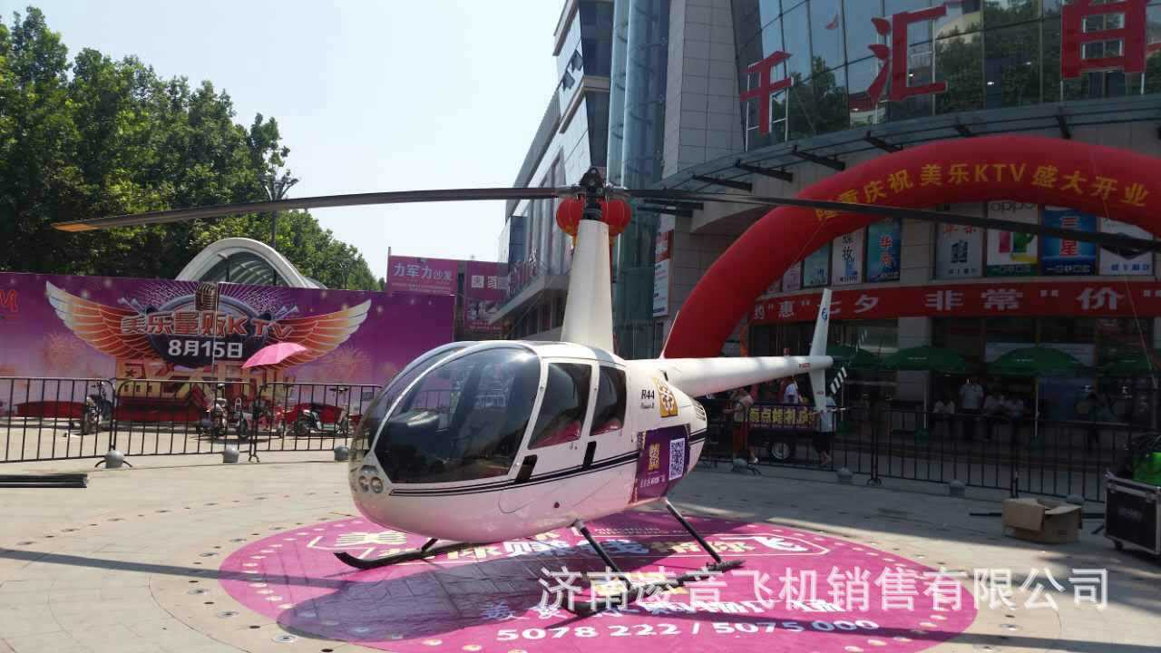 记者通过这次活动的策划人了解到,他们本次活动使用的的直升机由济南凌音飞机销售有限公司提供,该公司出租的这架飞机是由罗宾逊直升机公司生产的R44 (RAVEN)轻型直升机于1996年正式投入市场,该机机身长11.6米,宽度2.3米,高度1.8米。 R44 (RAVEN)的机体线条优美,其设计符合空气动力学原理,既提高了速度和效率,巡航速度可高达210公里/小时,最大航程达640公里,最大爬升率为4000多米。R44直升机独特的设计及可靠的性能是私用、商用和通用航空的理想选择,目前在通用航空市场运用非常广泛。